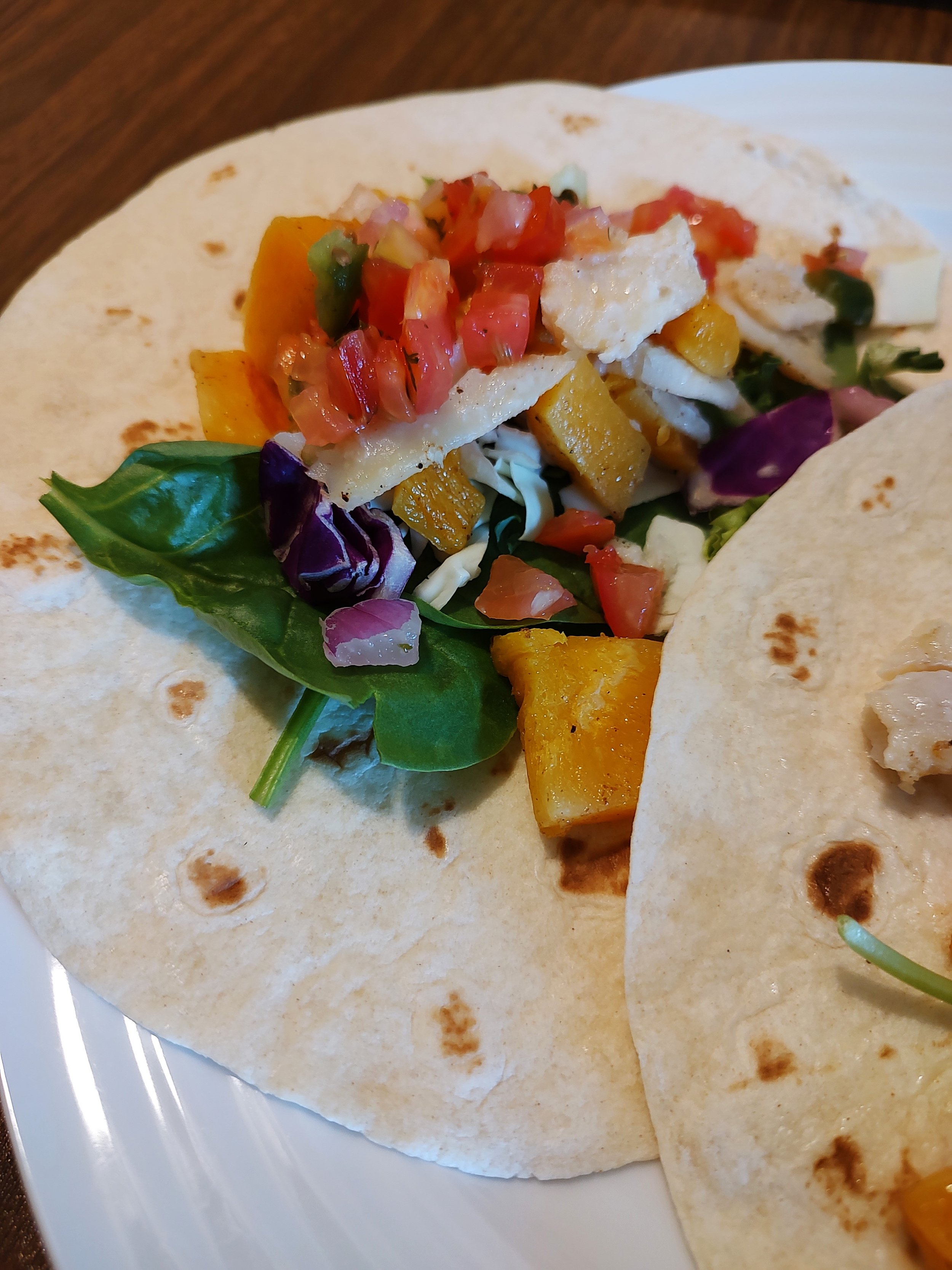 Fish taco with spinach, summer squash, cabbage, flounder, avocado, and pico de gallo.